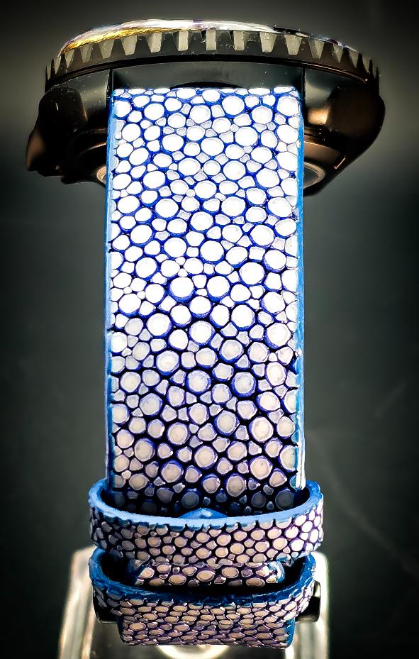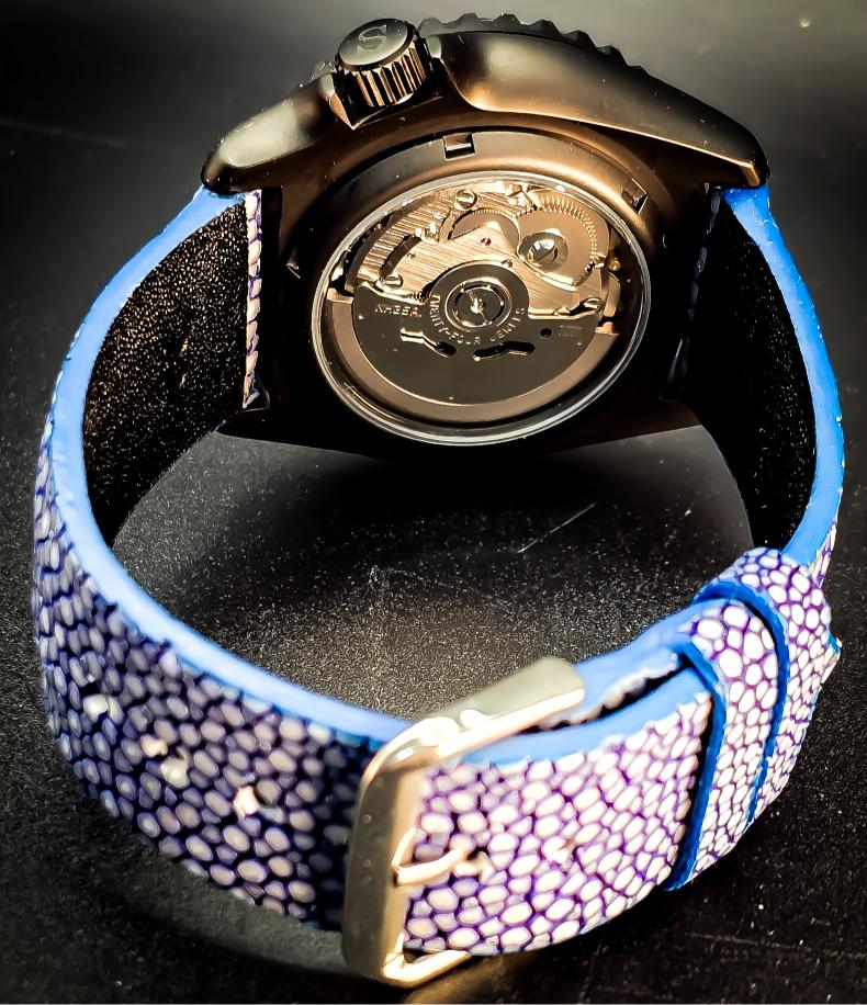 The strap shown is a luscious stingray, but the standard pairing is a 22mm blue FKM rubber strap with quick release, premium grade, and built for comfort. With 3 ATM water resistance and a screw down crown, it’s ready for late night swims, rooftop hangs, and spontaneous road trips.
