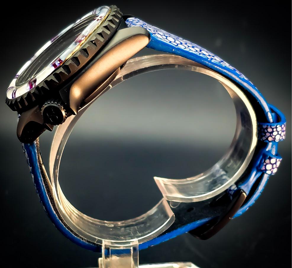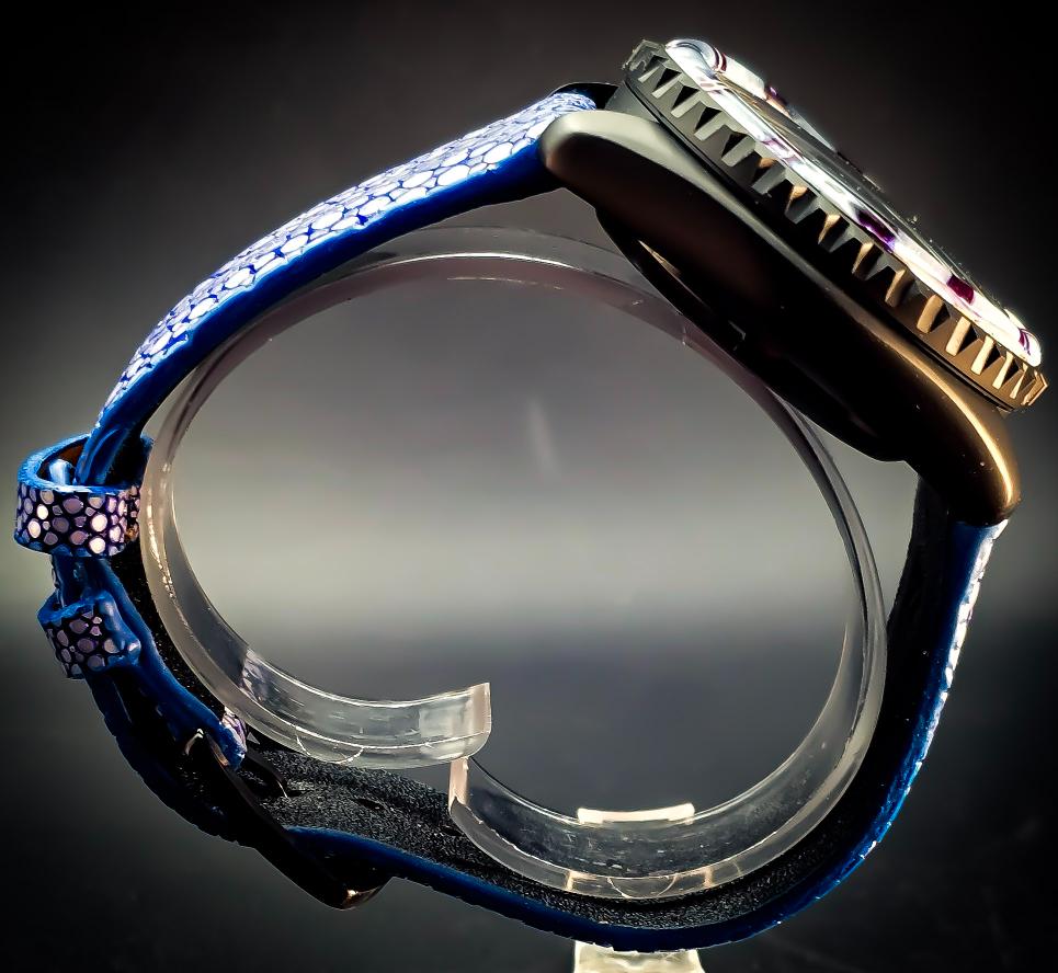 The dial is hand painted in rich indigo tones, with custom lumed indices that glow like early twilight. Paired with a custom resin bezel insert that pulses with subtle blue energy, it’s designed to stand out without shouting. The color matched hands glide with quiet confidence, keeping time with a suble invitation of rebellion.
