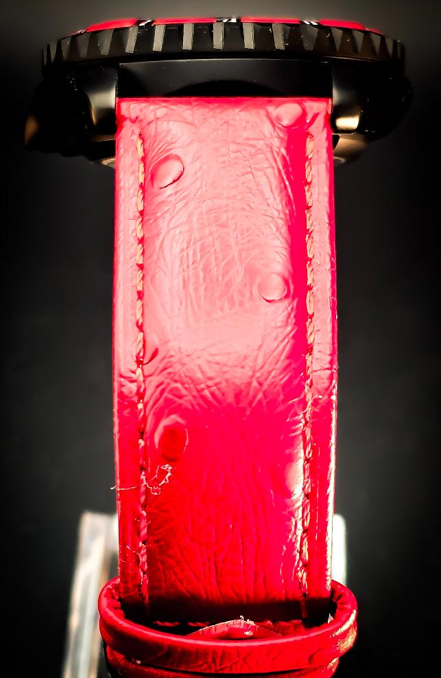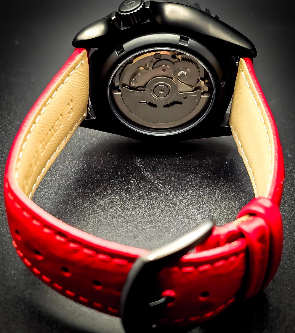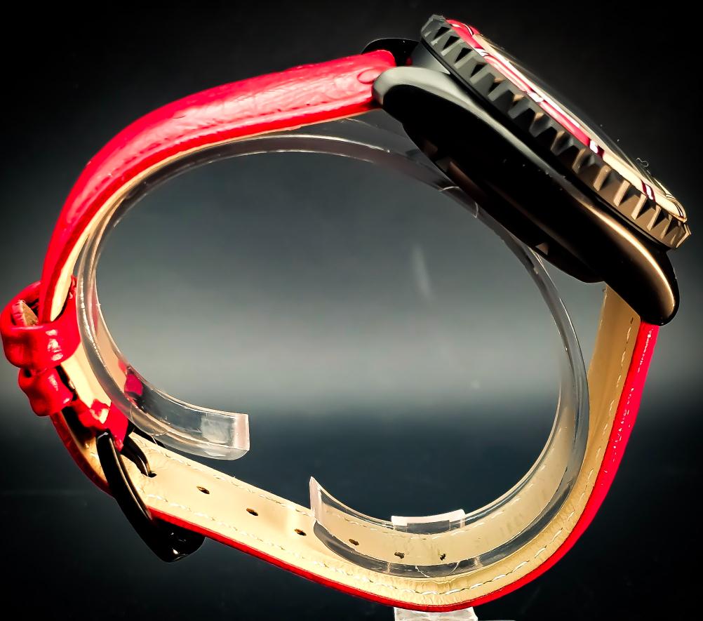 The strap shown is a deep red ostrich leather, textured and luxurious. The standard pairing is a 22mm cherry toned premium grade FKM rubber strap with quick-release, ready for spontaneous summer nights. With 3 ATM water resistance and a screw down crown, it’s built for boardwalk strolls, rooftop dances, and late-night drives.
