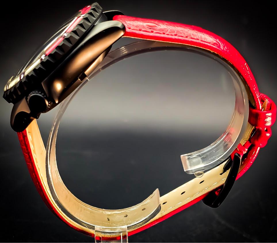 The dial is a rich cherry red, hand-painted with custom lumed indices that glow like neon signs at dusk. The custom bezel insert adds a subtle shimmer, catching light like a soda pop fizz. Color matched hands sweep across the dial with effortless grace, keeping time with a kind of quiet magnetism.