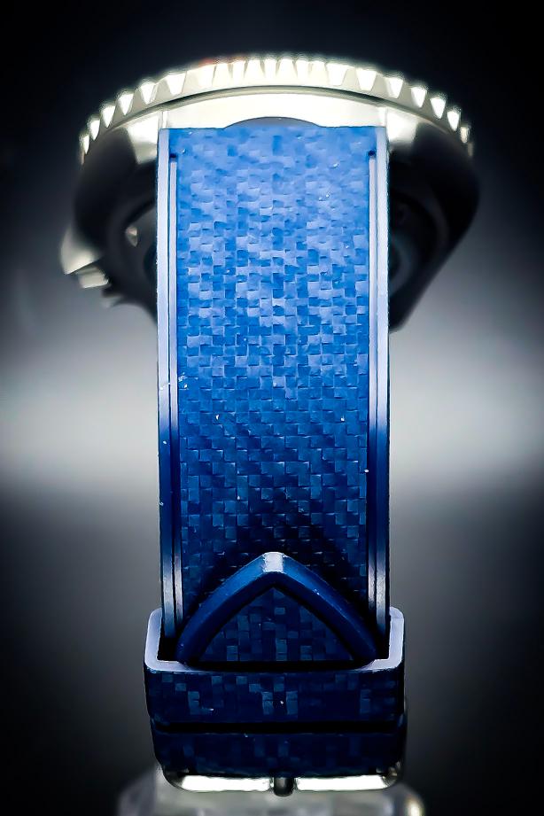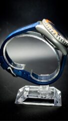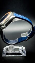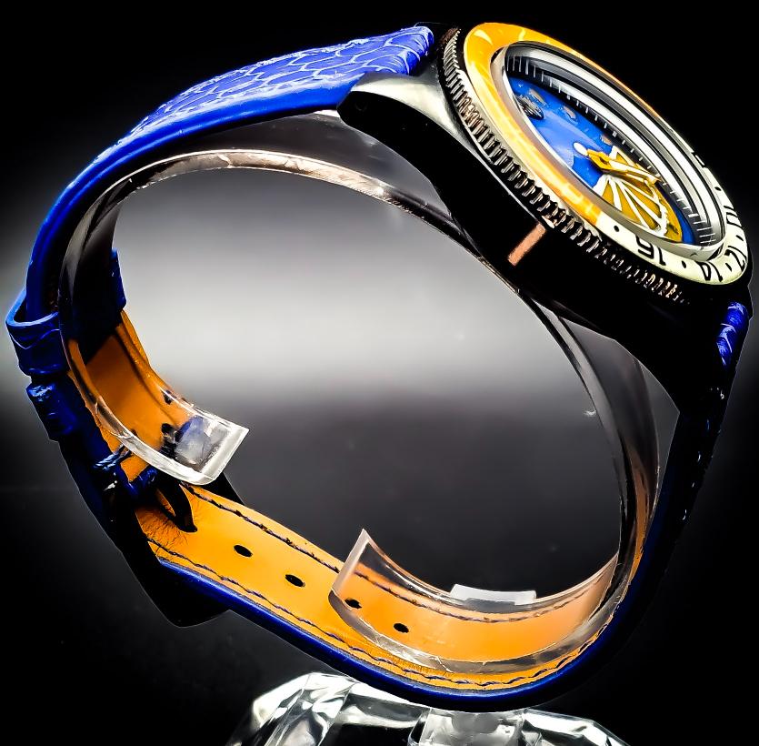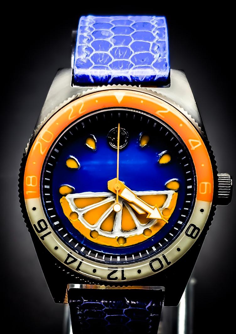 The dial is a deep ocean blue, interrupted by a radiant half slice of orange that glows from within. Each segment of the fruit is fully lumed, matching the orange indices that arc across the dial like sunlight through a glass of soda pop. It’s playful, surreal, and unmistakably bold.