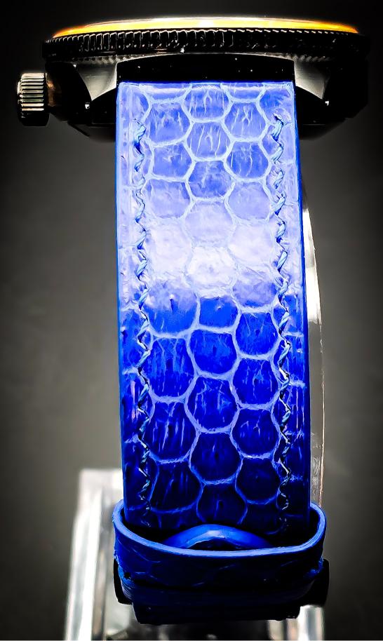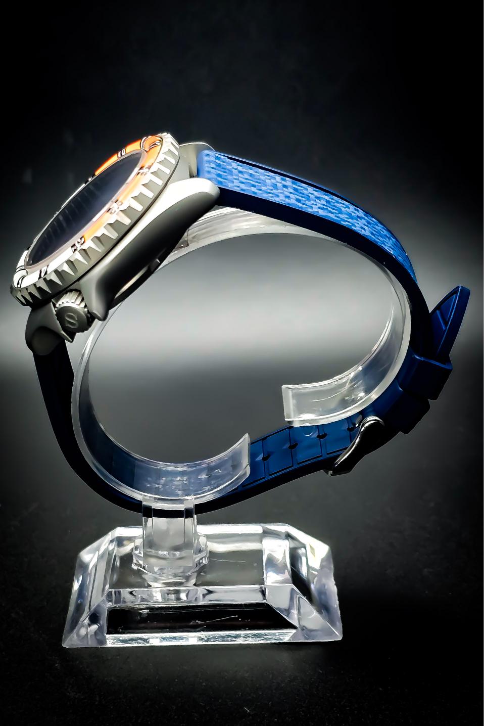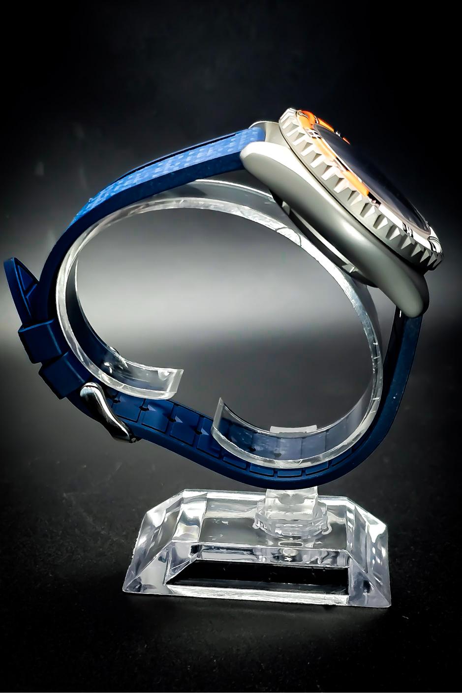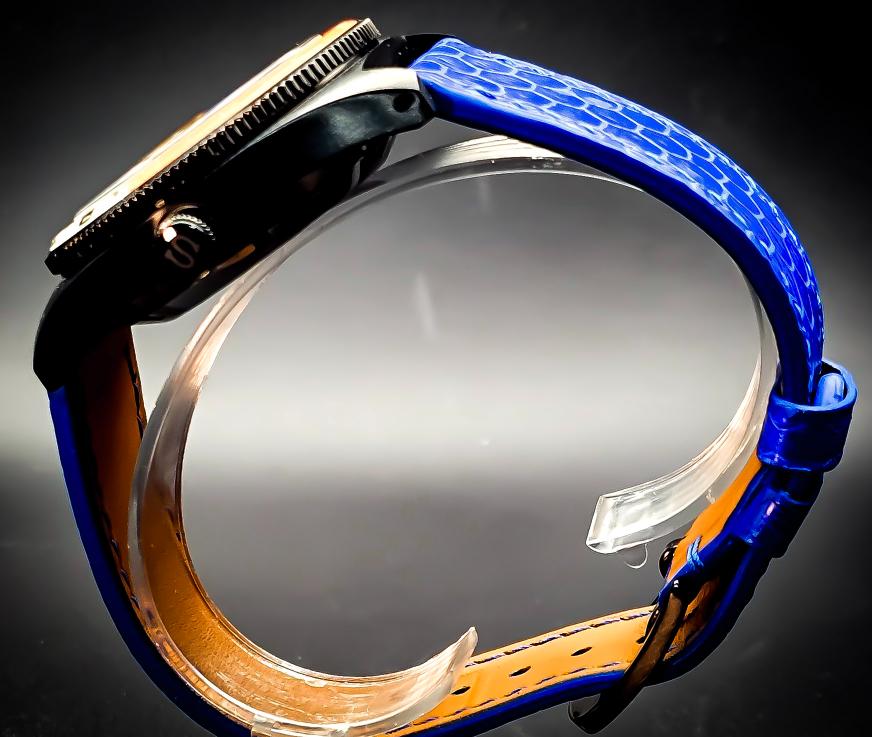 The strap shown is a rare blue sea snake that is luxurious, textured, and unlike anything else in the lineup. The standard pairing is a 22mm blue FKM rubber strap: quick-release, premium grade, and built for everyday comfort. With 3 ATM water resistance and a screw-down crown, Orange Dream is ready for beach walks, backyard lounging, and twilight bike rides.